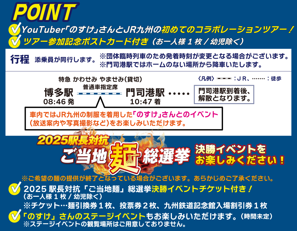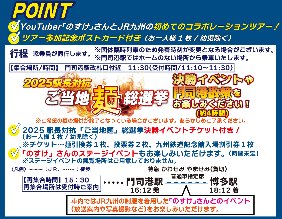 (1) ツアー名称:YouTuber「のすけ」さんと行く!「特急 かわせみ やませみ」乗車と2025駅長対 抗「ご当地麺」総選挙決勝イベントを楽しむ旅【博多駅発門司港駅着コース】【門司港駅発博多駅着コース】