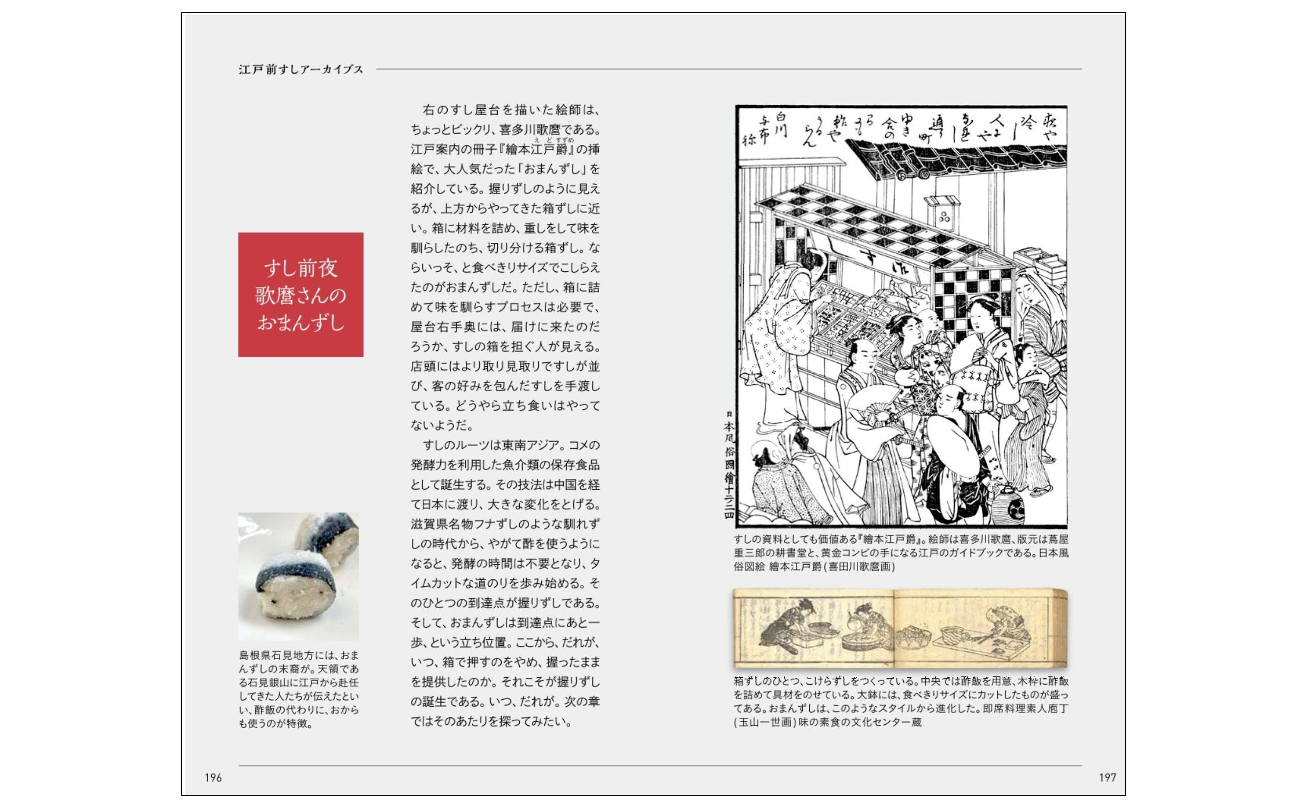 江戸時代の握りずし誕生前夜から現代までを通観する、巻末の「江戸前すしアーカイブス」は、本書のもうひとつの読みどころ。豊富な浮世絵や歴史資料を眺めながら、1貫の背景にある文化と、時代の味覚を感じ取れます。