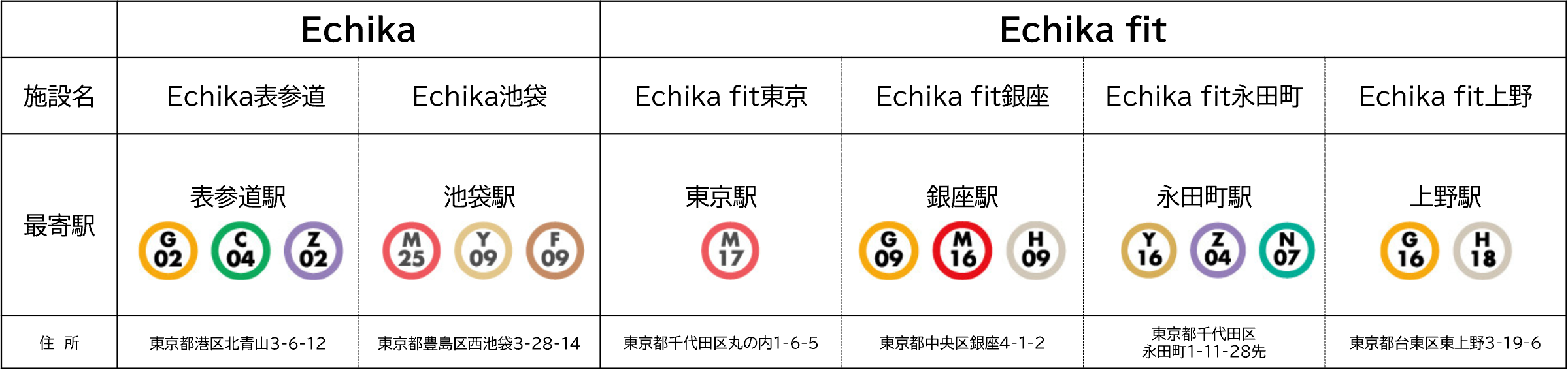 - 対象施設:Echika表参道・池袋、Echika fit東京・銀座・永田町・上野