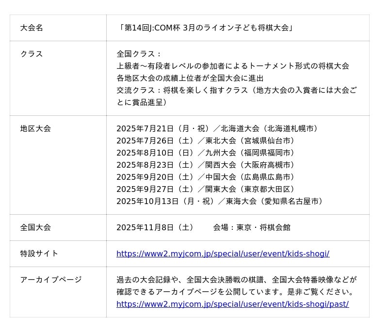J:COMと囲碁・将棋チャンネルでは、これからも「J:COM杯 3月のライオン子ども将棋大会」を通じて次世代を担う若者たちの挑戦を支援するとともに、大会の運営・放送を通じて将棋の普及に貢献してまいります。