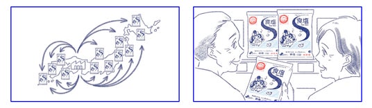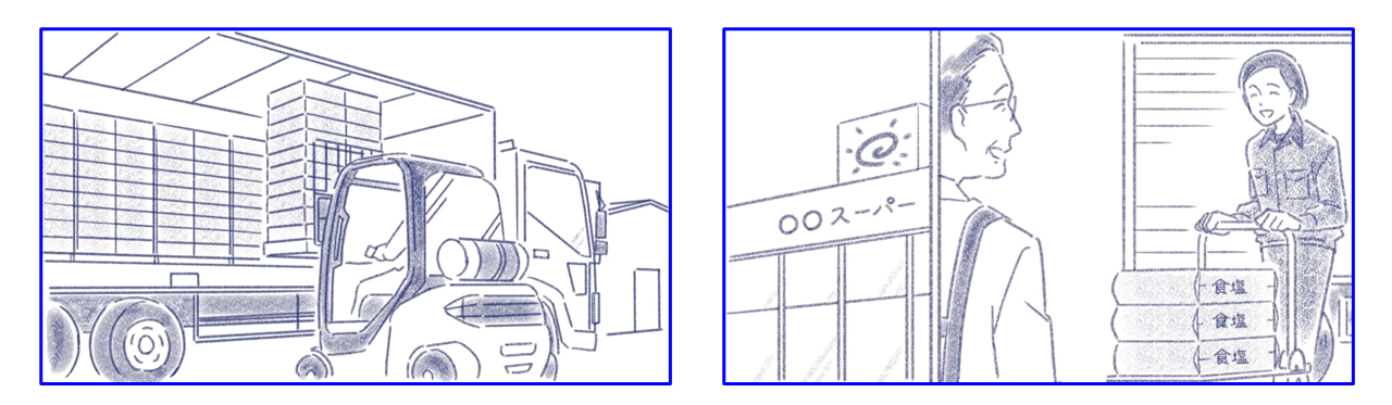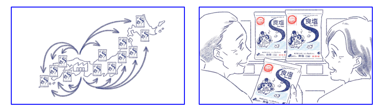 「食塩1kg」は、昭和52(1977)年の発売以来、長年日本の台所を支えてきたロングセラー商品です。代表的な家庭用の塩商品として、全国各地への塩の安定的な供給を担うとともに、災害等の緊急時に備えて備蓄されるという役割も持っています。この度、当センターでは、「食塩」や、「食塩」を販売する塩事業センターについてより多くの方に知っていただくために、動画を作成し、本日公開しました。「食塩」がつくられ、運ばれて皆様の暮らしのなかでお使いいただいている様子を手書き鉛筆画調の短い動画(パラパラ漫画動画)でご紹介します。なお、動画には約90秒のフルバージョンと、約30秒のダイジェスト版があります。