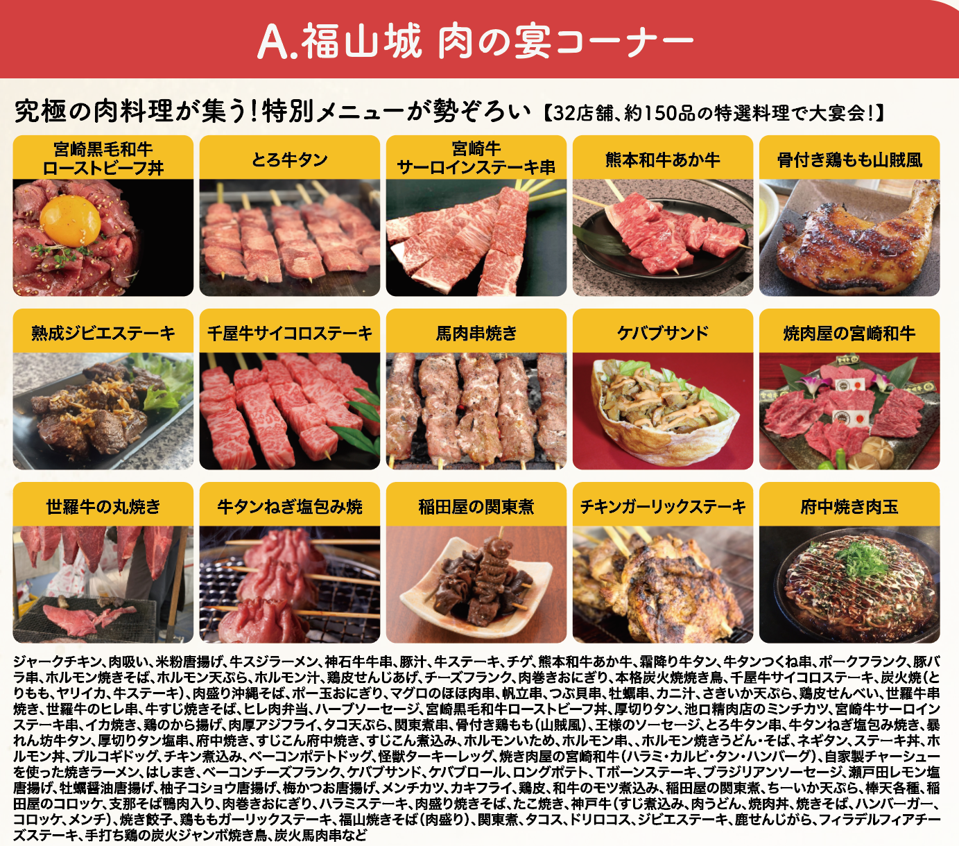 1.肉の大宴会:究極の肉料理が福山城に大集結。32店舗、約150品の特選料理が集う福山最大級の肉の宴