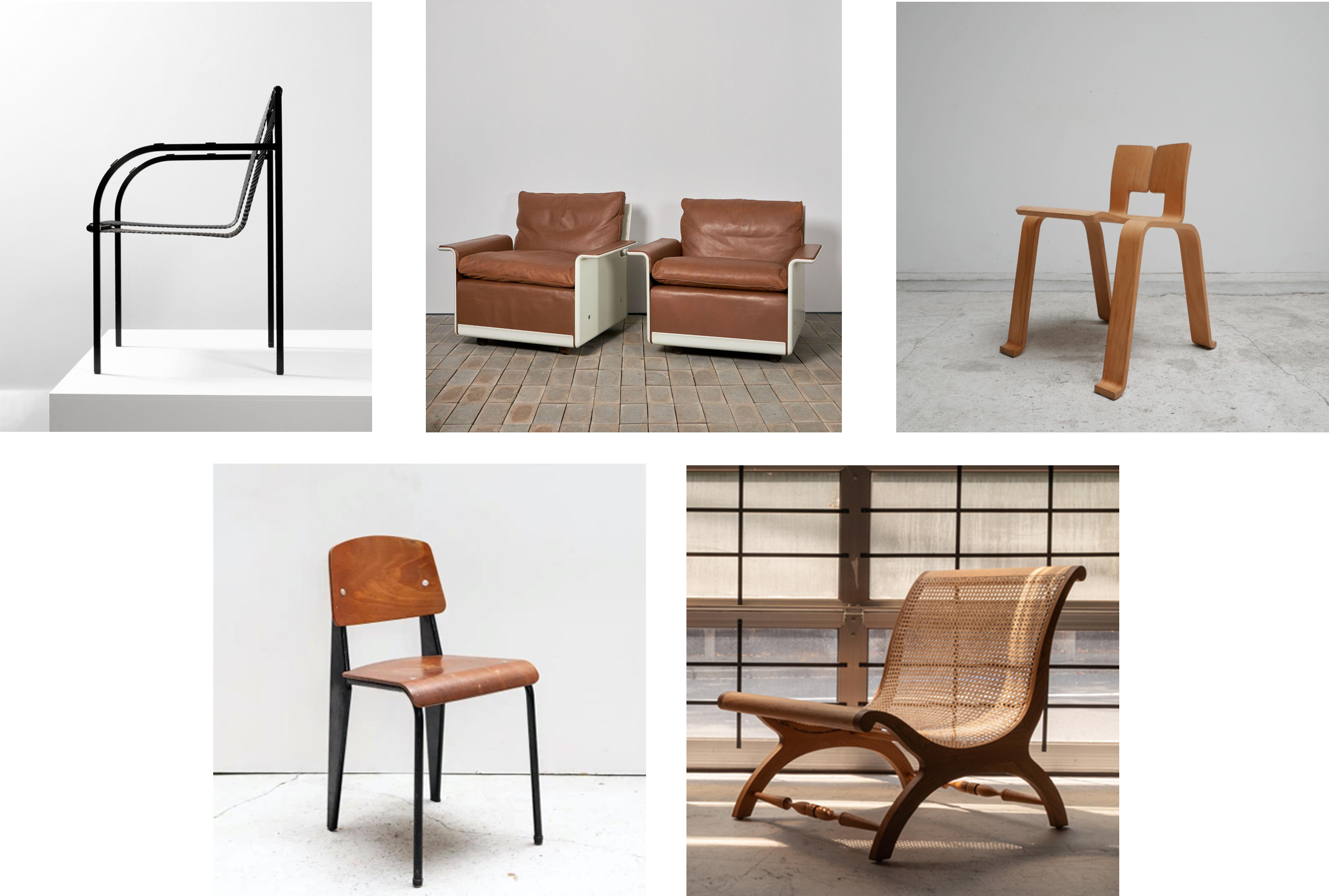 上段:左から、Expanded metal chair(Shiro Kuramata)、620 Chair Programme(Dieter Rams)、Ombra TOKYO Chair(Charlotte Perriand)下段:左から、Standard Chair(Jean Prouve)、Bentota Lounge Chair(Geoffrey Bawa)