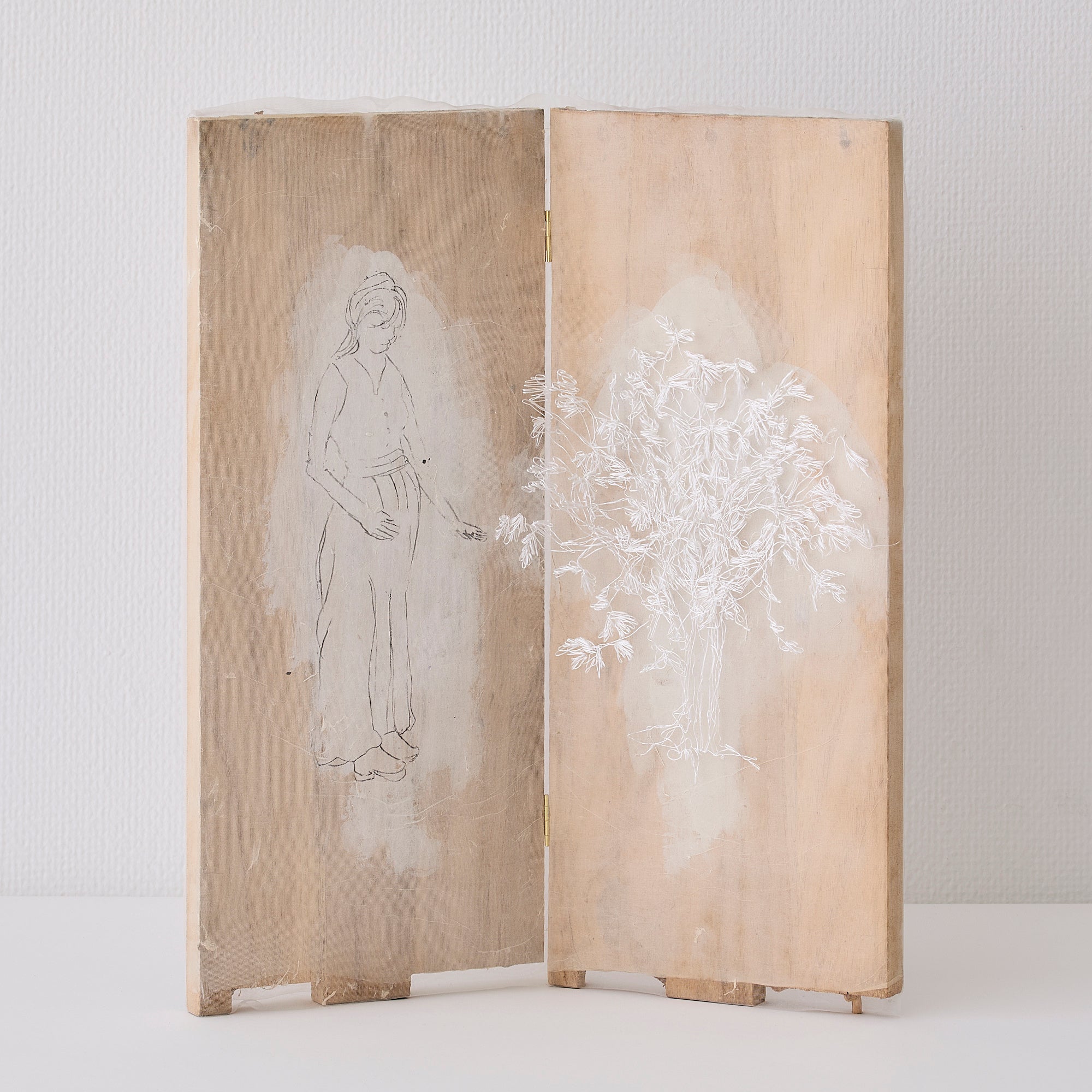 竹村 京 「S.M. と復活したケヤキ」 桐ダンスの破片、釜糸、雁皮紙、膠液、クレヨン、水彩絵具、絹オーガンジー 2025