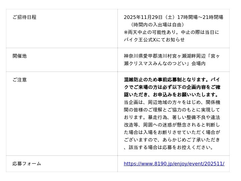 ビジョンである「バイクライフの生涯パートナー」の実現に向けて、事業を展開する株式会社バイク王&カンパニー(代表取締役CEO:澤篤史、本社:東京都世田谷区、証券コード:3377、以下「当社」)は、ライダーの皆様が充実したバイクライフをおくるための機会提供、ならびに神奈川県愛甲郡清川村(以下、「清川村」)周辺の地域振興を目的とし、宮ヶ瀬湖畔で開催されるイルミネーションイベント、第39回「宮ヶ瀬クリスマスみんなのつどい」(以下、当イベント)に、バイクでご来場予定の方を特別ご招待いたします。