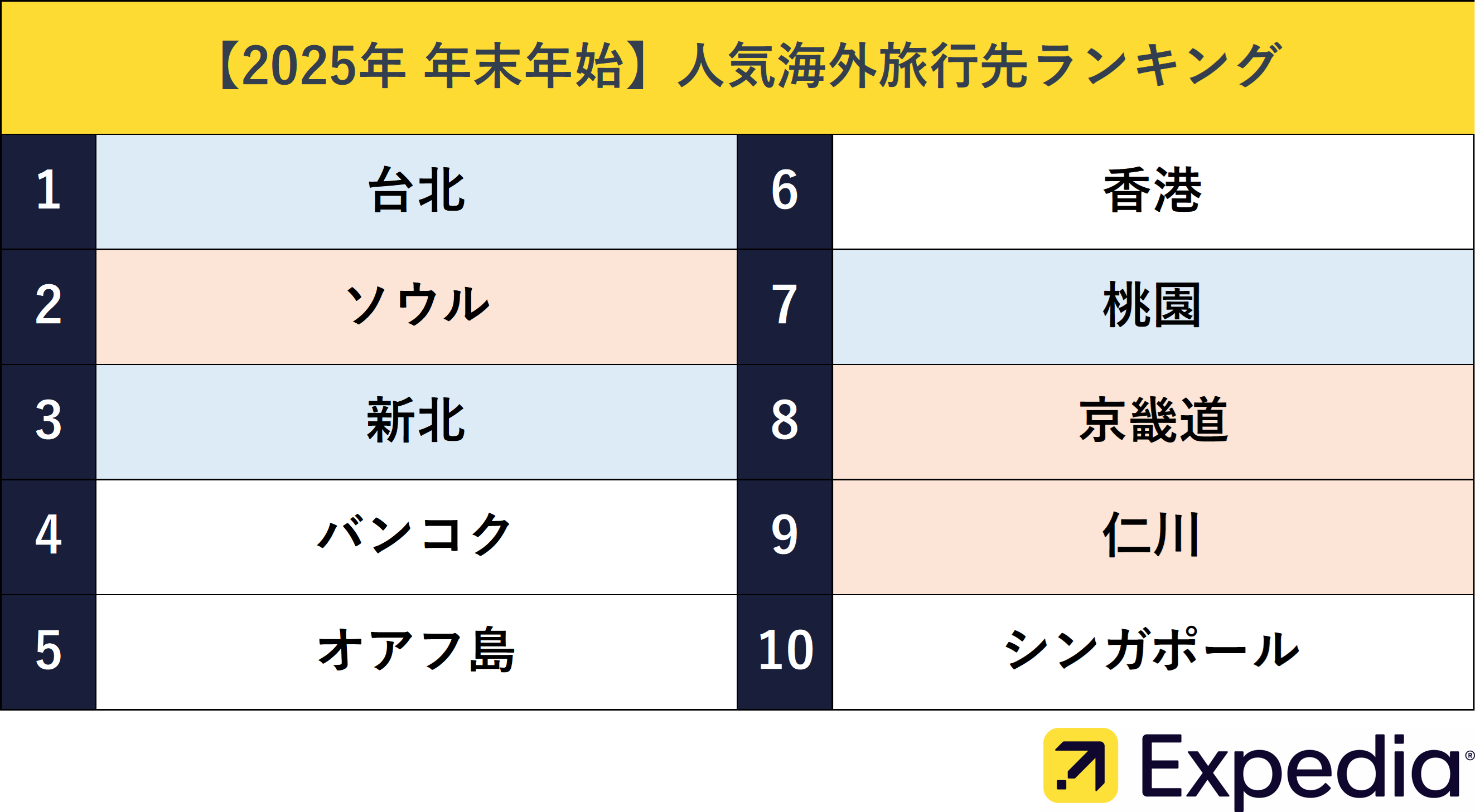 *2 エクスペディアにおける2025年の年末年始の人気海外旅行先ランキング11位~30位のうち、昨年の年末年始