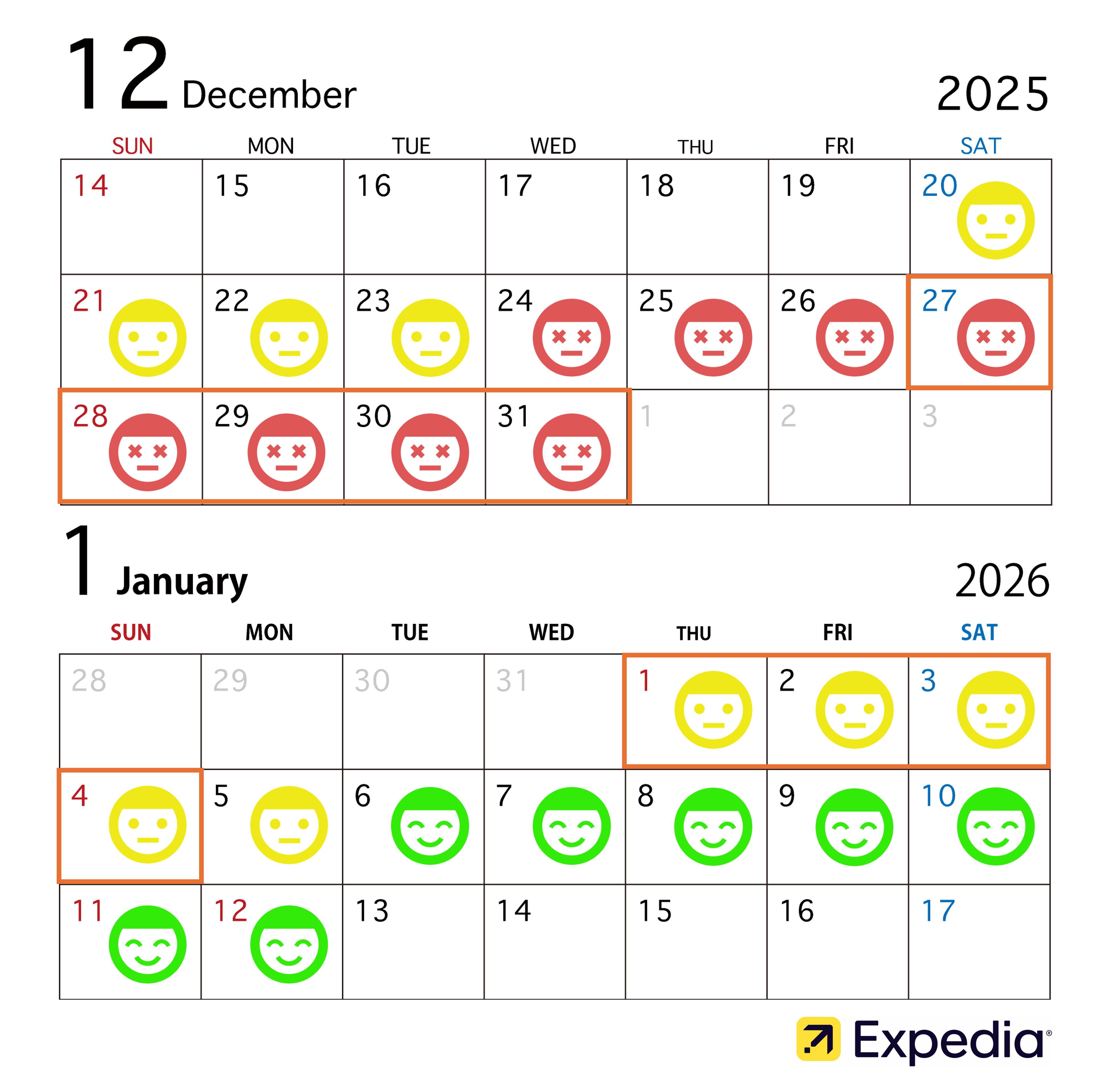 A6. エクスペディアの昨年末の1泊あたりの平均宿泊費と平均航空券代のデータ[3]をもとに予測すると、年明け1月6日(火)以降の出発が比較的費用を抑えられます。クリスマスから年末にかけては料金が高くなる傾向があるため、年明けの出発がお得です。