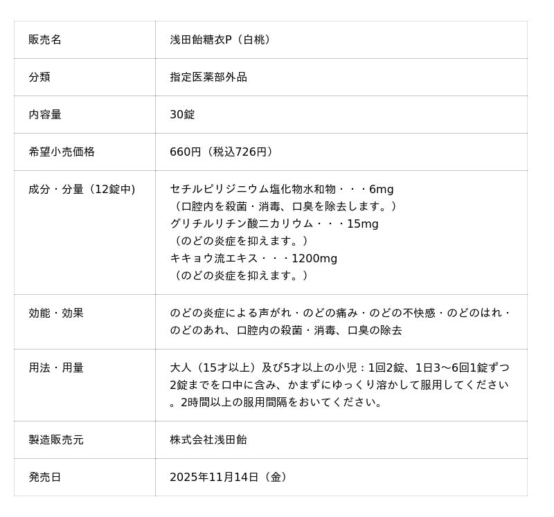 株式会社浅田飴(所在地:東京都千代田区、代表取締役社長:玉木 卓)は、指定医薬部外品「浅田飴糖衣P(白桃)」の数量限定デザイン缶「浅田飴糖衣P Limited Edition 2026」を、2025年11月14日(金)より販売いたします。