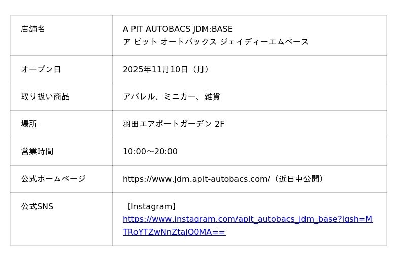 住友不動産商業マネジメント株式会社(本社:東京都新宿区 代表取締役社長:山本 直人)が運営する「羽田エアポートガーデン」に、株式会社オートバックスセブン(本社:東京都江東区 代表取締役 社長:堀井 勇吾)が展開するコンセプトショップ「A PIT AUTOBACS JDM:BASE(ア ピット オートバックス ジェイディーエムベース)」が新規出店いたします。