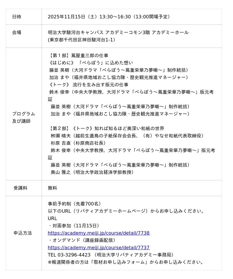 明治大学の生涯学習機関「明治大学リバティアカデミー」は、11月15日(土)に公開講座「蔦屋重三郎の仕事と和紙の世界《福井県連携講座》」を駿河台キャンパスで対面およびオンラインで開催します。事前予約制で、参加費は無料です。