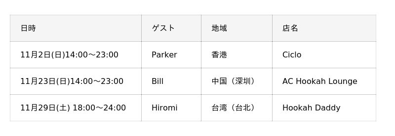 また、くじ引きイベントのほかにも、11月2日(日)、23日(日)、29日(土)の3日間、海外からそれぞれ別のゲストをお招きして特別なシーシャの体験もご提供。