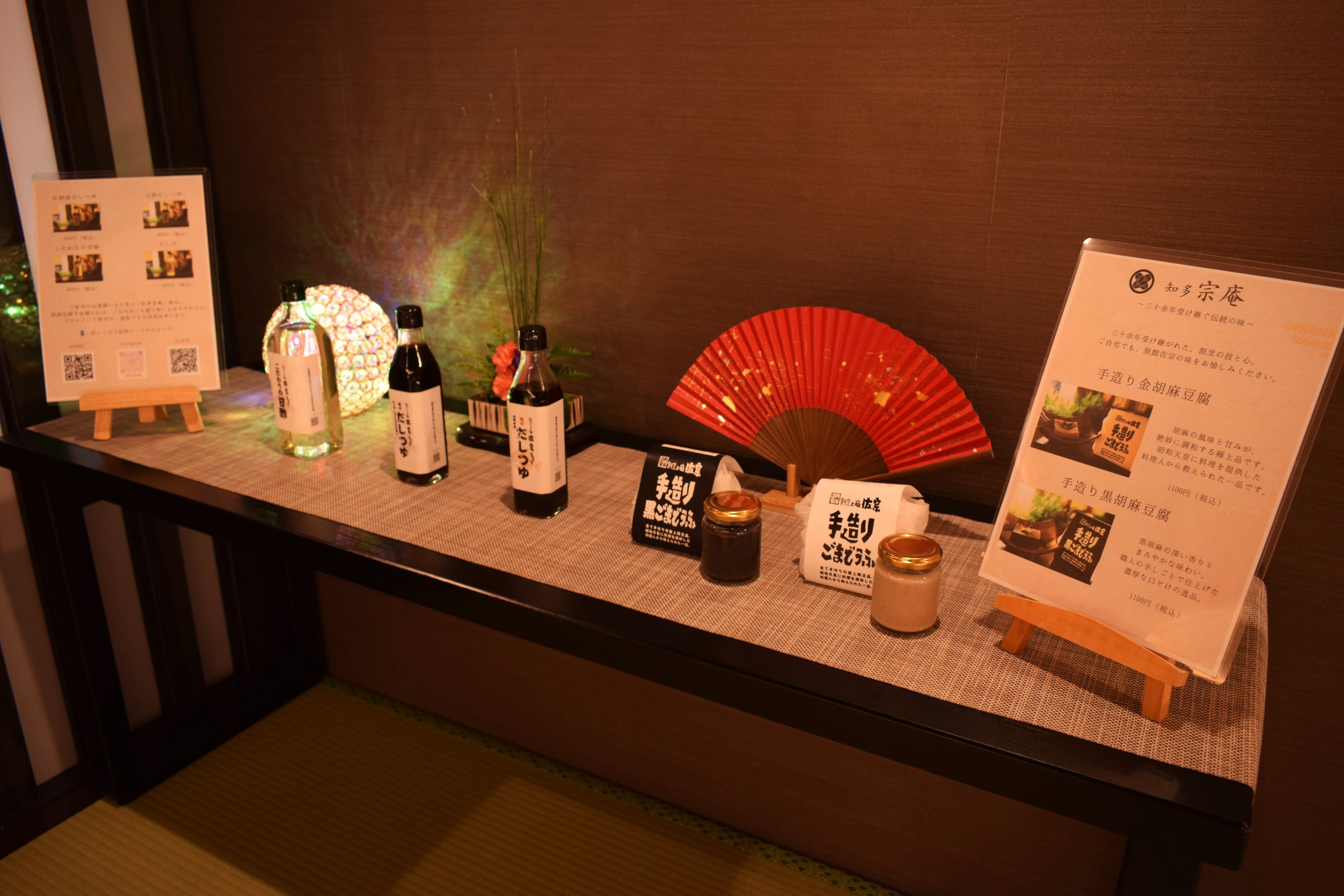 宿で実際に提供している胡麻豆腐や調味料。職人の味をそのままご家庭へ届ける『知多宗庵』のラインナップ