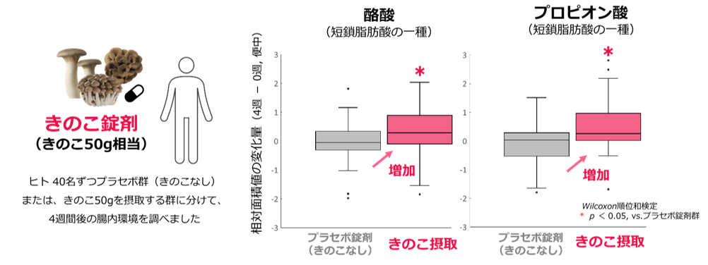 試験概要:本試験は、株式会社メタジェンとホクト株式会社の共同研究として実施しました。参加者80名を、きのこを含まないプラセボ錠剤を摂取する群と、マイタケ・ブナシメジ・エリンギから作製したきのこ錠剤を摂取する群に分け、4週間の摂取試験を行いました。その結果、4週間後にはプラセボ群に比べ、マイタケを含むきのこ錠剤群で、便中の短鎖脂肪酸の一種である酪酸およびプロピオン酸の有意な増加が認められました。