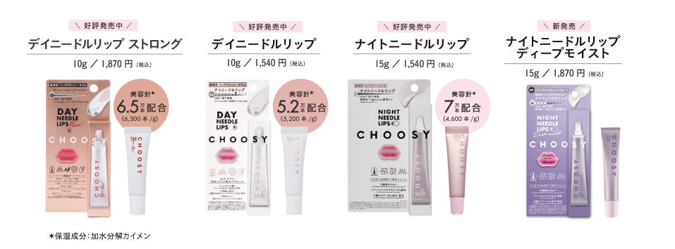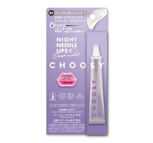 株式会社サン・スマイル(本社:東京都港区/代表取締役社長:田中徳也)は「ワタシ史上、最高※5の唇へ」がコンセプトのリップケアブランド「CHOOSY(チューシー)」から夜用美容針※2リップトリートメント『ナイトニードルリップ』の高保湿タイプ『ナイトニードルリップ ディープモイスト』を2025年11月14日(金)※3より全国のロフト※4およびロフトネットストア、全国のPLAZA※4およびPLAZAオンラインストア、公式オンラインストアにて一次先行発売、2025年12月1日(月)より全国のドン・キホーテ系列店舗※4にて二次先行発売、2026年2月2日(月)より一般発売します。