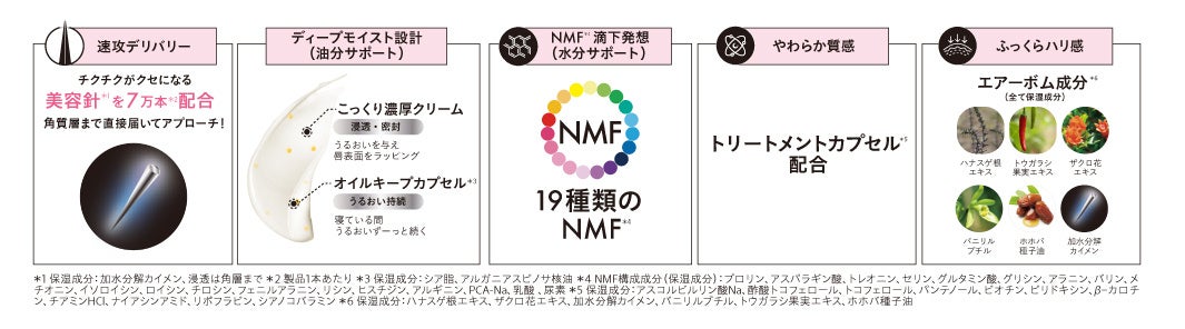 ※5 自社従来品比 ※6 製品1本あたり ※7 NMF構成成分(保湿成分):プロリン、アスパラギン酸、トレオニン、セリン、グルタミン酸、グリシン、 アラニン、バリン、メチオニン、イソロイシン、ロイシン、チロシン、フェニルアラニン、リシン、ヒスチジン、アルギニン、PCA-Na、乳酸、尿素 ※8 角質層まで