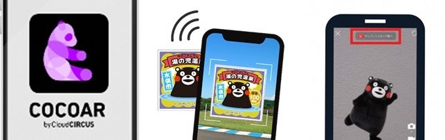 STEP2. 温泉施設に着いたら、COCOARを開いて、掲示されているくまモンをスキャン!くまモンと写真撮影ができるARが出現。写真撮影後は画面をスワイプすると、 くまモンが周辺観光地をご案内します。