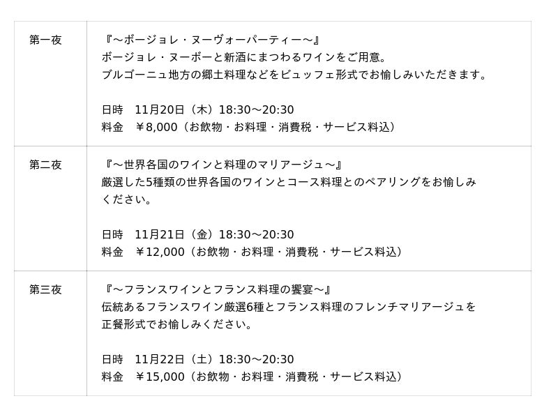 第一夜は解禁したてのボージョレ・ヌーヴォーと新酒にまつわるワインをご用意。ブルゴーニュ地方の郷土料理などをビュッフェ形式でお愉しみいただけます。第二夜は厳選した5種類の世界各国のワインとコース料理とのマリアージュをテーマに、第三夜は伝統あるフランスワイン6種とフランス料理のフルコースで珠玉のペアリングをご提供いたします。年に一度の解禁日を多くのワインファンとともに祝いましょう。