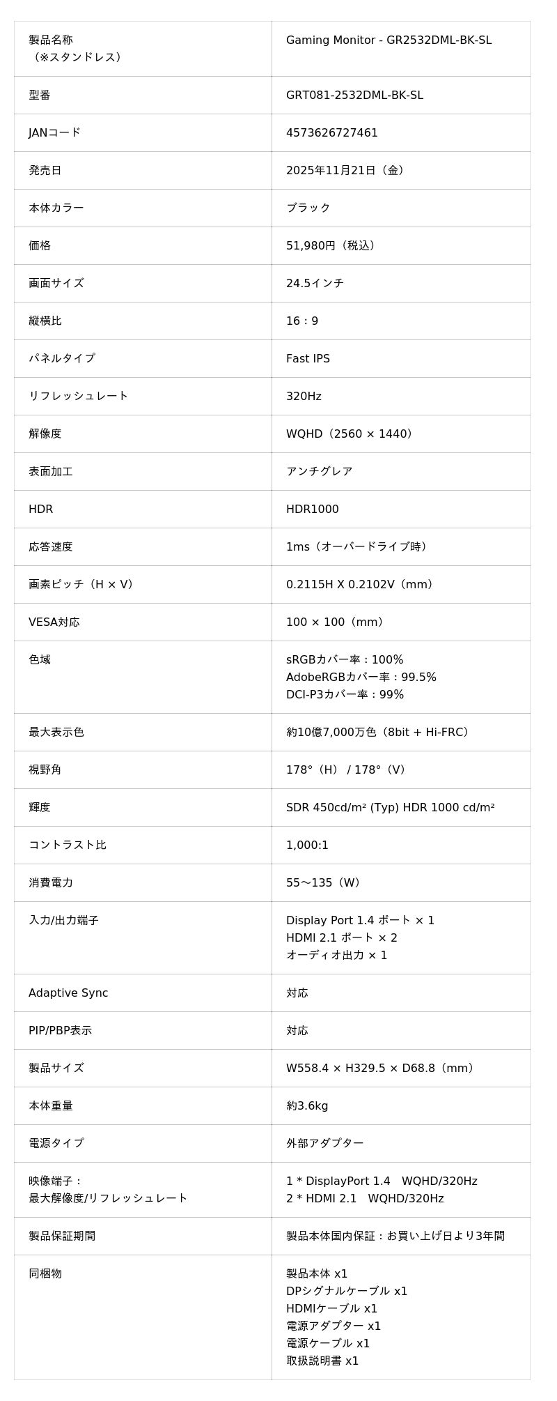 Gaming Monitor - GR2532DML-BK-SL(スタンドレス)51,980円(税込)