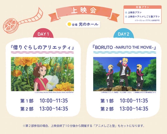 上映会では、DAY1にスタジオジブリの『借りぐらしのアリエッティ』、DAY2にはスタジオぴえろの『BORUTO -NARUTO THE MOVIE-』を上映。親子で世代を超えて楽しめる人気作品が登場します。