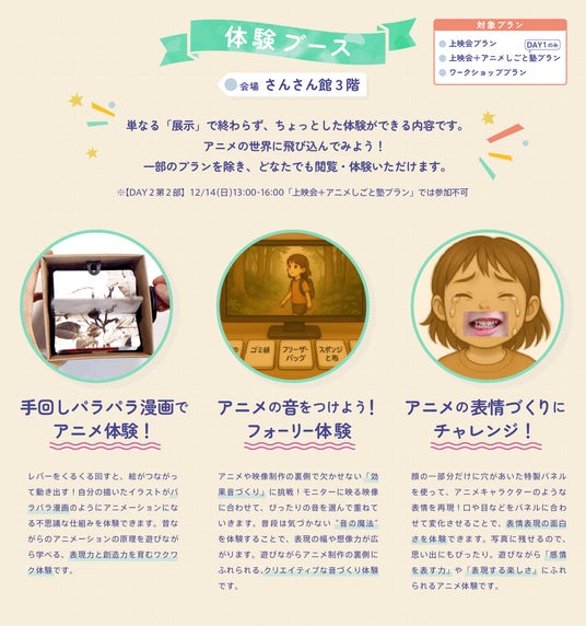 その他、誰でも気軽に参加できる体験ブースを展開。「手回しパラパラ漫画でアニメ体験!」「フォーリー体験」「アニメの表情づくりにチャレンジ!」など、アニメの"音"や"動き"を体感しながら学べます。