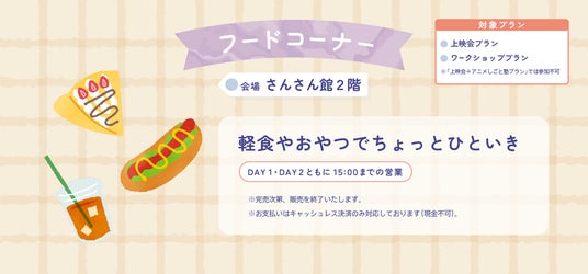 会場内には親子で一息つける「フードコーナー」も登場。軽食やおやつを販売し、キャッシュレス決済で手軽に利用できます(現金利用不可)。イベントを通して一日ゆったりと滞在できるよう配慮された空間です。