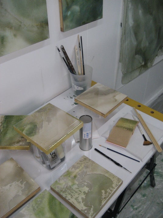 ・金箔、樹脂、鉱物顔料を幾層にも重ねる"トップストーン技法"