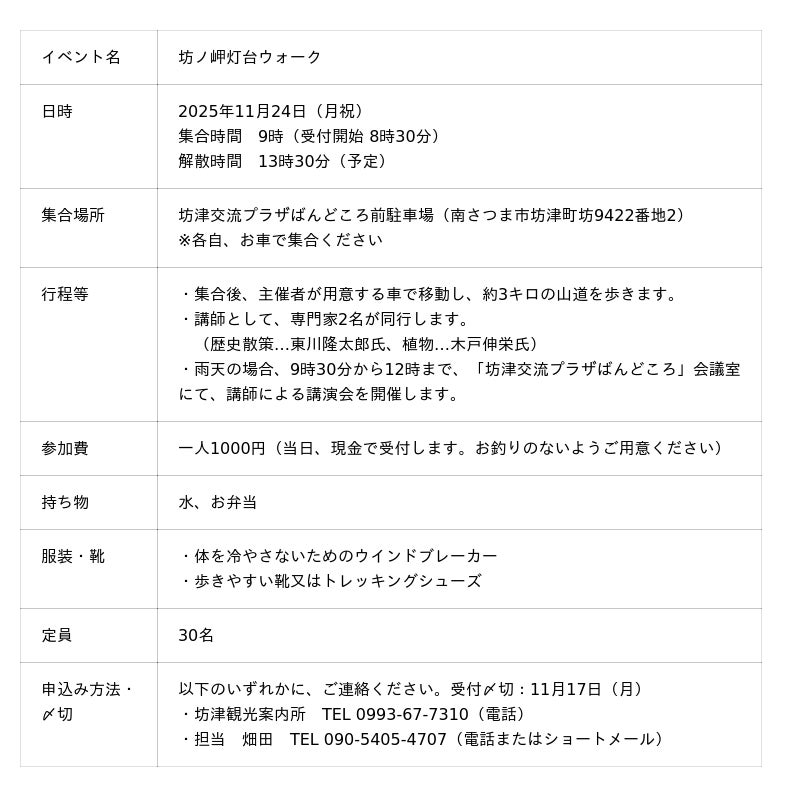 坊ノ岬灯台活用活性化委員会(幹事社:特定非営利法人坊津やまびこ会)は、2025年11月24日(月祝)、「坊ノ岬灯台ウォーク」を開催いたします。約3キロの道のりを、歴史・植物の専門家とともに歩き、地域の知られざる歴史や植物の魅力、灯台からの海の絶景を楽しむことができるハイキングツアーです。定員は30名、参加費1000円、参加申込受付は11月17日まで。なお、雨天時には専門家の講演会を行います。