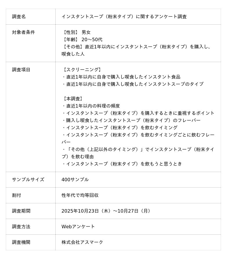 本調査では、インスタントスープ(粉末タイプ)を直近1年以内に購入・喫食した20~59代男女を対象に、購入時に重視するポイントや、飲むタイミングごと(朝食や昼食など)に飲むフレーバー、飲もうと思うときなどを含むアンケートを実施しました。