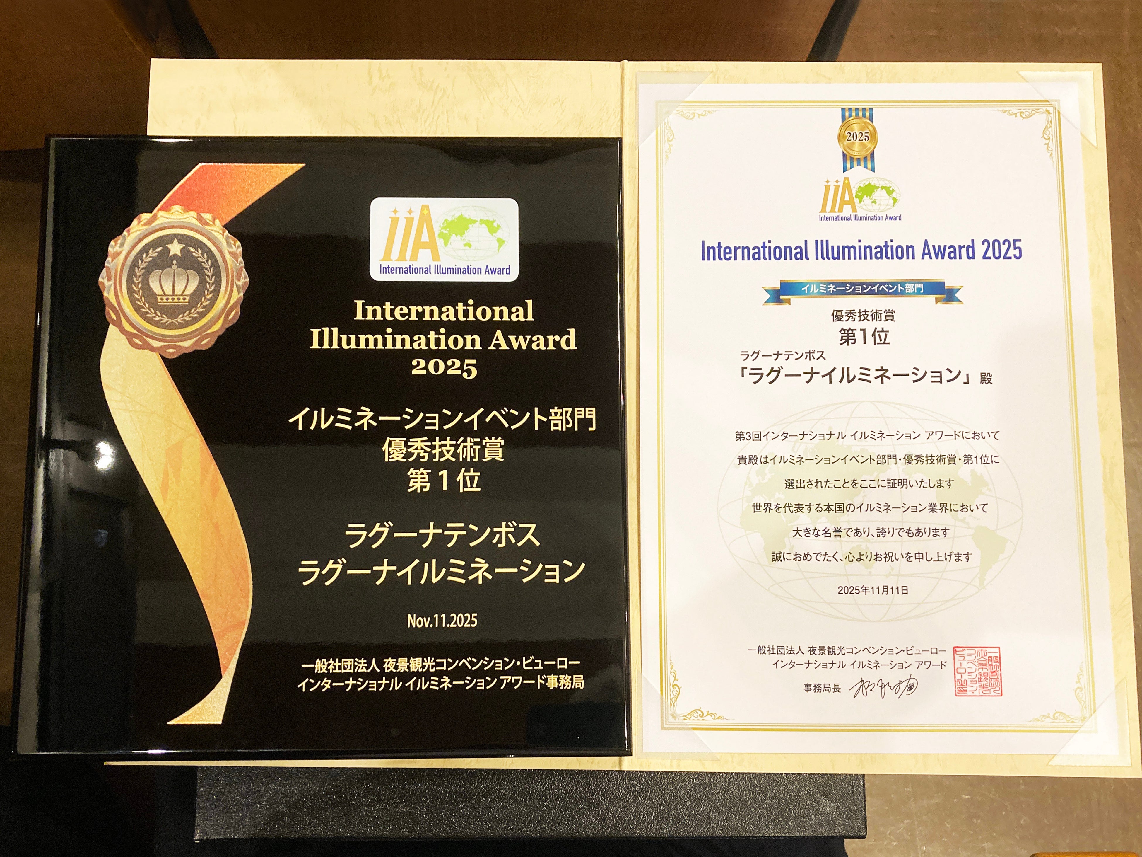 株式会社ラグーナテンボス(所在地:愛知県蒲郡市、代表取締役社長:小寺 康弘)が運営するテーマパーク「ラグナシア」にて開催している恒例の冬季イベント「ラグーナ イルミネーション」が、一般社団法人夜景観光コンベンション・ビューロー(代表理事:丸々 もとお)と、ぴあ株式会社が主催する「International Illumination Award 2025(通称:IIA)」にて、「イルミネーションイベント部門」優秀技術賞 第1位 を受賞しました。