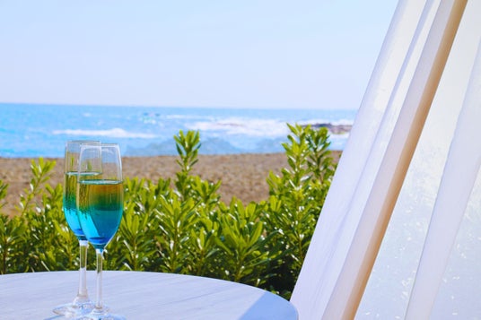 足元には白い砂が広がり、まるでビーチにいるような感覚でくつろげる「ビーチラウンジ」。解放感のある窓からは、時間帯によって異なる海の表情を楽しめます。昼は海を眺めゆったりと、夕暮れも幻想的な雰囲気でドリンク各種をお楽しみいただけます。