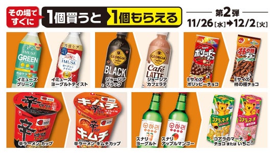 「デカ盛りチャレンジ」では、"デカ盛り"な弁当やおにぎり、パン、デザートなど計17商品(※)を2週に分けて発売。お値段そのままでボリュームアップする「ばくだんおにぎり炙り牛焼肉」や「トリプルハムチーズエッグサンド」などの他、驚きサイズかつお手頃価格の「デカ盛りプリン」など、食欲の秋から冬にかけて、がっつり食べたいお客様にぴったりのラインナップをお届けします。同時開催の「1個買うと1個もらえる」企画では、対象商品を購入すると、その場で使える無料引換券がもらえるおトクなキャンペーンを展開。リピート購入を後押しし、家計にも嬉しい施策として人気を集めています。