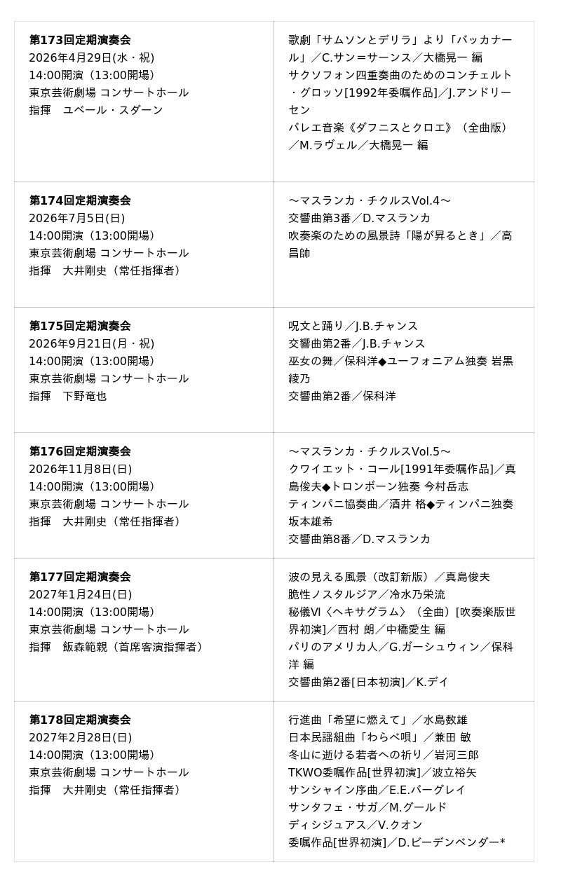 東京佼成ウインドオーケストラ(所在地:東京都杉並区、理事長:勝川本久、以下TKWO)は、2026-27シーズンのコンサートスケジュールを発表しました。