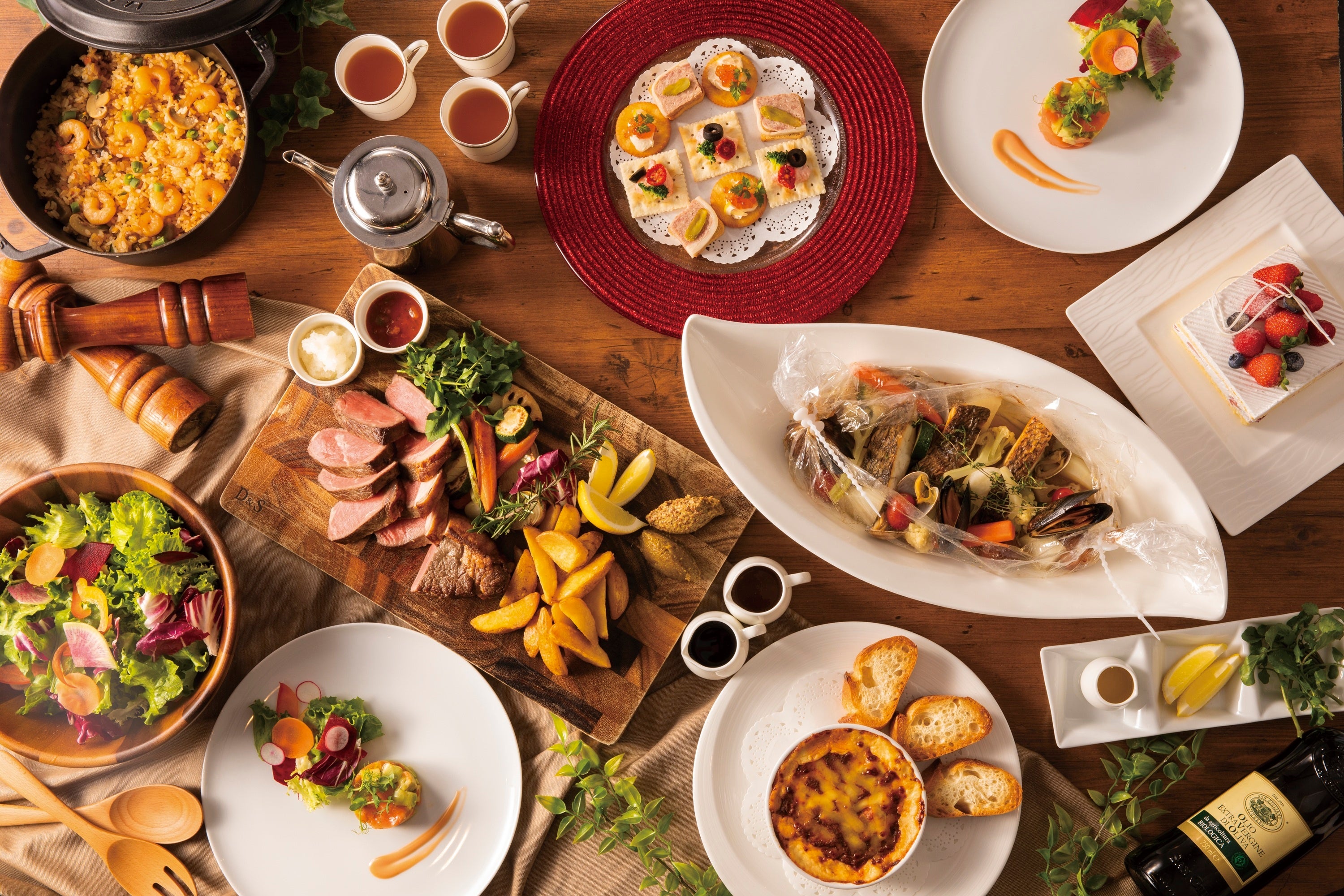 さらに、ストウブ鍋でふっくら炊き上げた「海老の洋風炊き込みご飯」や、香ばしく焼き上げた「ミートマカロニグラタン」、食後にはパティシエ自慢の「季節のショートケーキ」をご用意。大人からお子様まで、みんなで楽しめるメニューが揃っています。