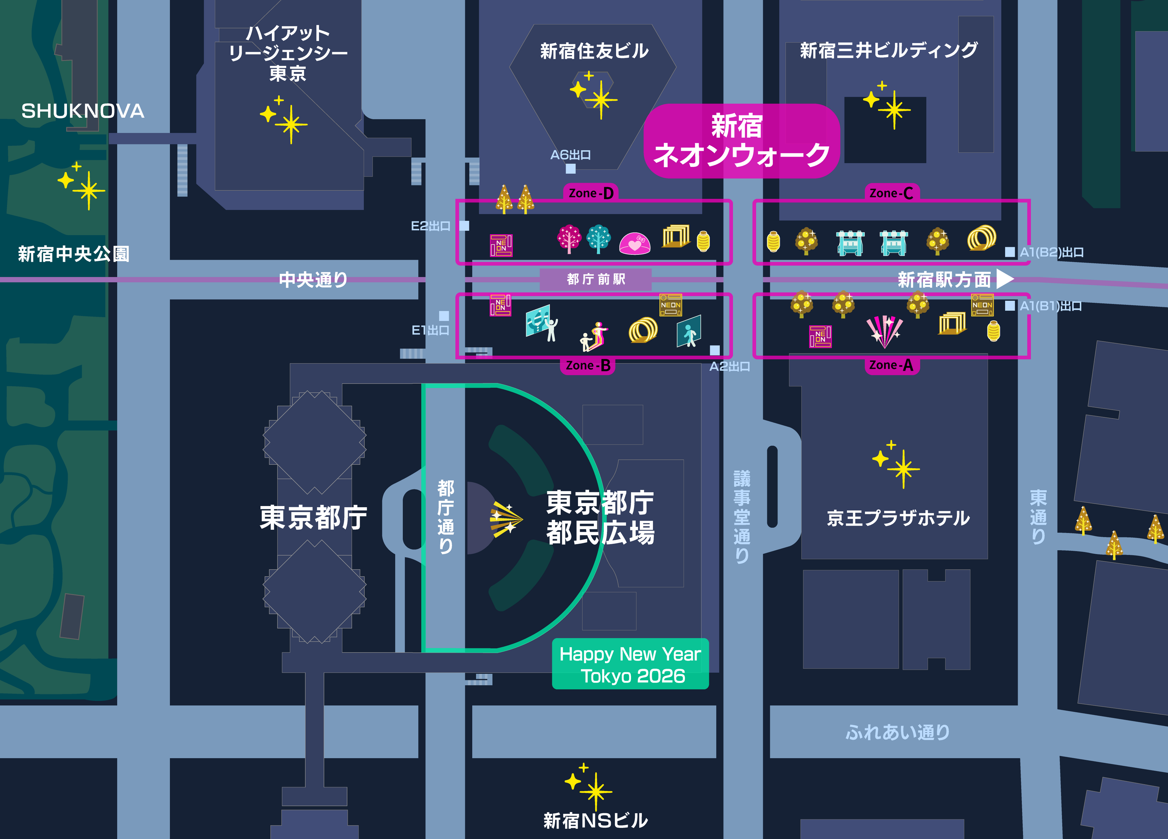 本プロジェクトでは、「伝統」と「革新」が融合する街・東京を象徴する最先端の体験型アートイルミネーション「Shinjuku Neon Walk」(読み:シンジュクネオンウォーク)や、ここでしか体験できない華やかなカウントダウンイベント「Happy New Year Tokyo 2026」を開催することで、訪れる人々による賑わいを創出。