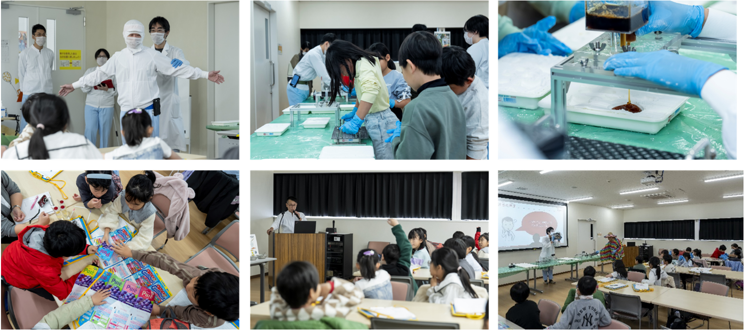 朝日工場では2024年より、朝日村の教育機関からの問い合わせをきっかけに工場見学の受け入れに取り組んでいます。グミの製造工程の学習や品質検査や食品衛生についても学んでもらい、グミ液を様々な型に流し込むグミ作り体験をしてもらうなど、好奇心や探求心を育むようなプログラムを提供しています。プログラムは、教育機関の要望を伺いながら朝日工場と松本工場のスタッフが連携しオリジナルのプログラムを考案。また、生産の様子がよくわかるようにグミ体験試作装置をスタッフが作成するなど工夫をしています。2024年は朝日村の保育園と小学校、松本市の小学校からの受け入れを行い、2025年は朝日村、松本市以外の教育機関の受け入れ、5回の工場見学を実施いたしました。