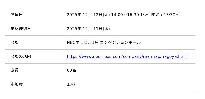2025年12月12日(金)14:00~16:30にNEC中部ビル1階 コンベンションホールにて開催します。