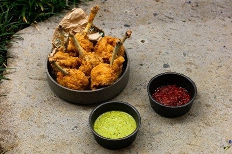 可愛らしいフライドチキンをスパイスの効いた自家製地中海風ダブルソースで。名前の通りワインバー・レストラン「Massif」のミニ版。朝はペイストリー、サワードウやピタを使ったランチから夜はおつまみで楽しめるお店です。