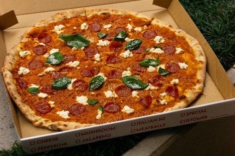 クリーミーなトマトソースをベースに2種のチーズとペパロニ、ブラックオリーブ、バジルをオン。