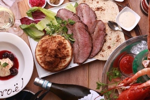 前菜(カナダ産ロブスタープラッター)、メイン(鹿児島特選黒毛和牛「中山黒牛」タコスセットと、チキン&ワッフル、Xmas特別デザート(チェリージュビレ)パン、コーヒー&カフェ
