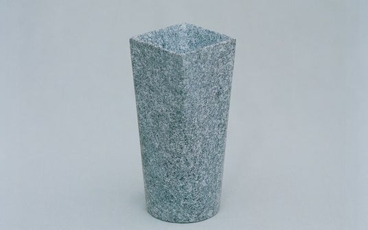 自他ともに認める大の酒好きな成田さんがオーダーしたのは、ゆっくりとお酒を楽しむため、片手で持ちあげられないくらい重い酒器。高級石材である庵治石を使った酒器は、成田さんを象徴する円と四角のメガネに由来する、底面が丸・天面が四角になったユニークなデザインに。