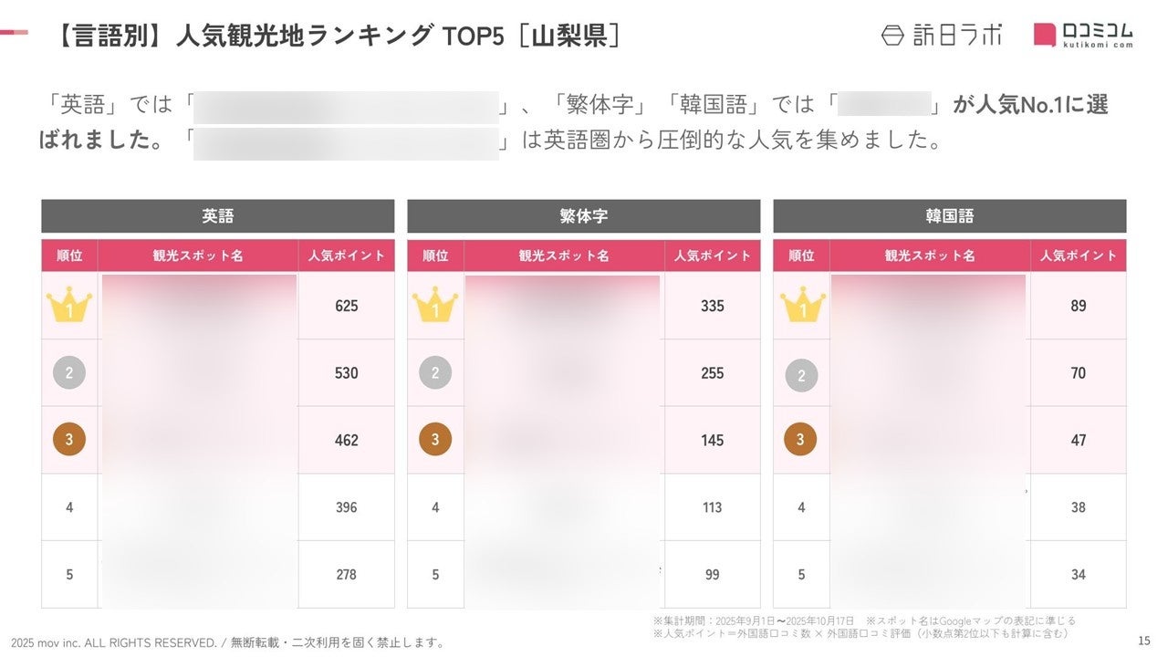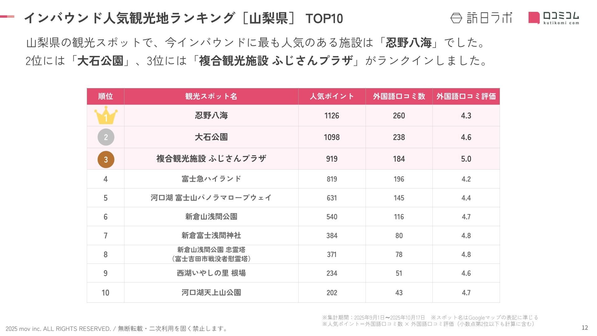 業界最大級のインバウンドビジネスメディア「訪日ラボ」及び 店舗向け集客一元化プラットフォーム「口コミコム」を運営する株式会社mov(代表取締役:渡邊 誠、本社:東京都渋谷区、以下mov)は、山梨県の観光地に寄せられた最新の口コミデータから、独自の『インバウンド人気観光地ランキング』を発表しました。