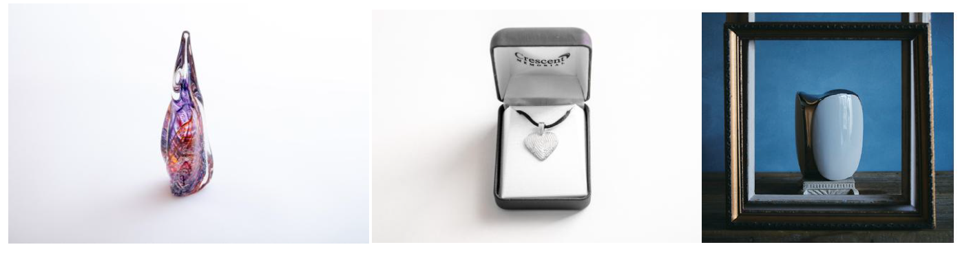ご遺骨の一部をアートガラスやジュエリーに封じ込め、美しいデザインとともに"大切な人との思い出やぬくもりを、いつもそばに感じられる「NOKOS」シリーズや、イタリアの職人による手づくり骨壺シリーズも多数展示しています。