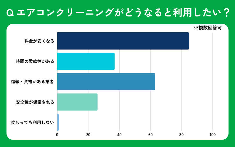 エアコンクリーニングのサービスや条件面において、どの点が改善されたら利用したいと思いますか?(複数回答可能)
