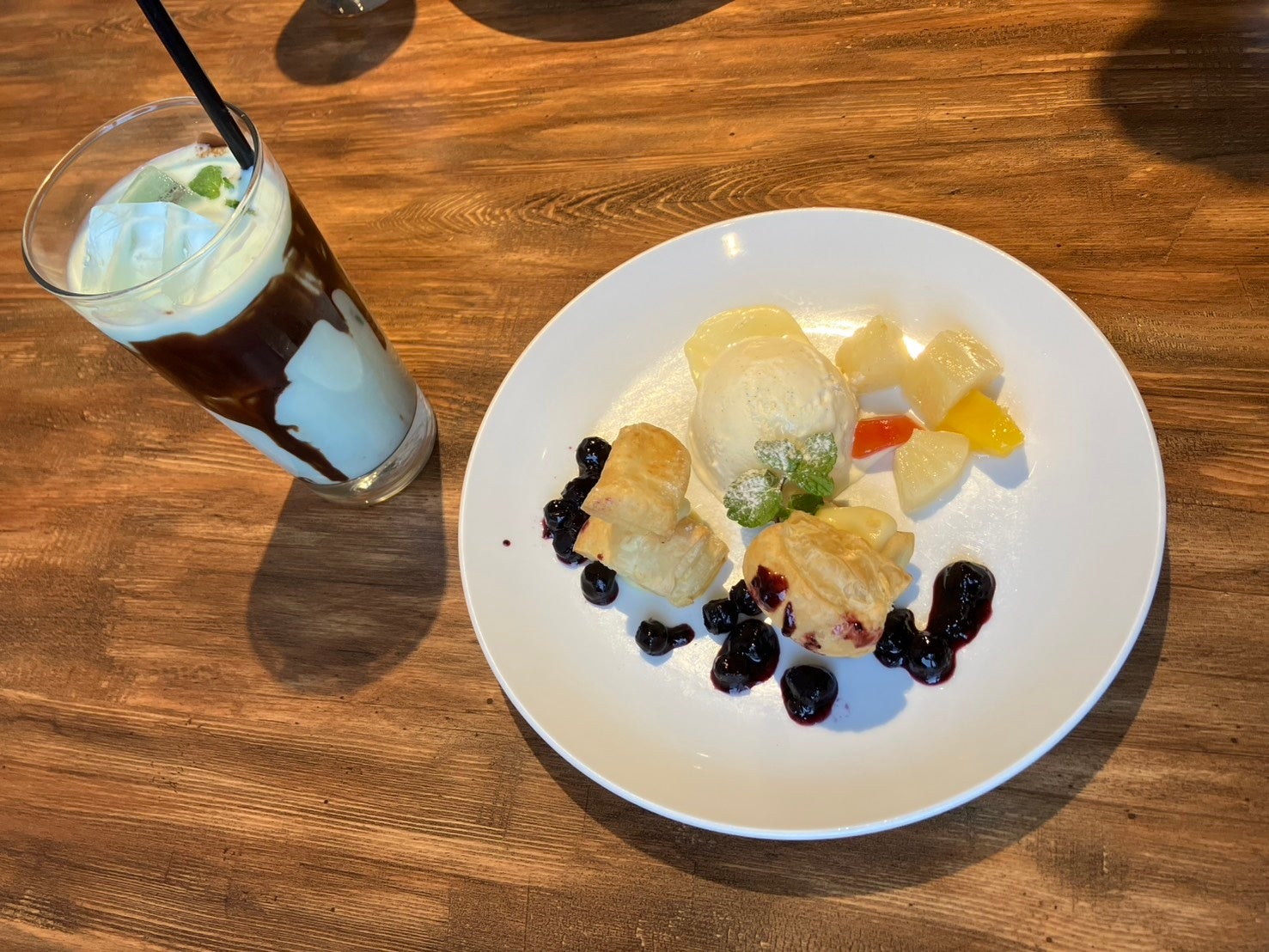 ・チョコミントミルクと自家製ベリーソースの焼きたてカスタードパイ