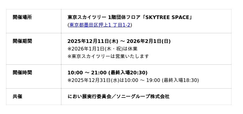 2025年12月11日(木)から2026年2月1日(日)まで、東京スカイツリー「SKYTREE SPACE」で開催される体験型イベント「におい展 PLUS+」において、ソニー独自のにおい制御技術を活用した体験型のイベントが開催されます。
