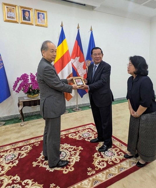 The presentation was made through the Japan-Cambodia Association (President: Fumiaki Takahashi), with the president himself handing the bottle to the Prime Minister.