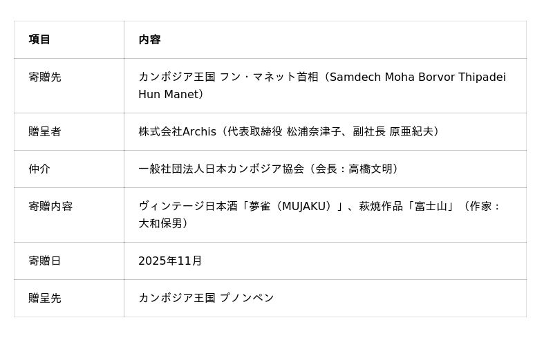株式会社Archis(本社:山口県山口市、代表取締役:松浦奈津子)は、2025年11月、山口県発の長期熟成型ヴィンテージ日本酒「夢雀(MUJAKU)」を、カンボジア王国 フン・マネット首相(Samdech Moha Borvor Thipadei Hun Manet)に寄贈いたしました。