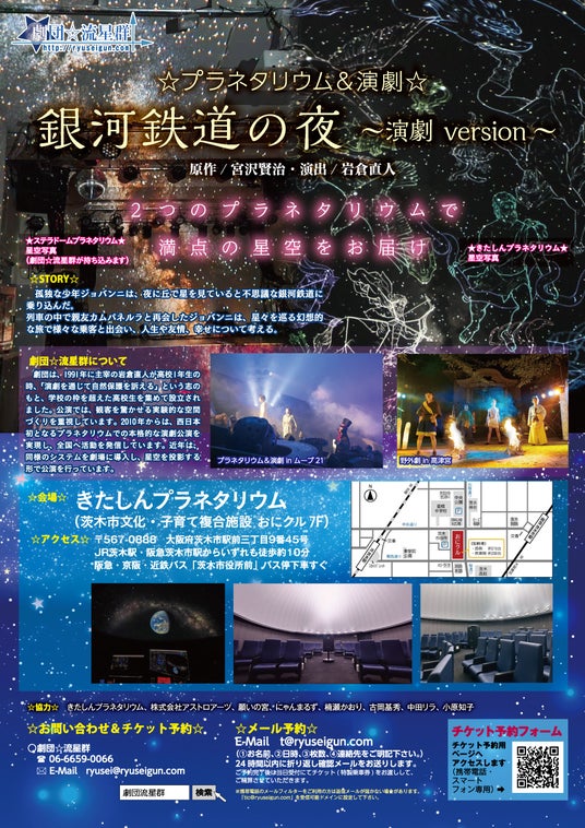 茨木市の「きたしんプラネタリウム(おにクル7F)」にて、2025年12月6日(土)19:00より、劇団☆流星群による本格的演劇公演『銀河鉄道の夜 ~プラネタリウム&演劇 version~』(原作:宮沢賢治/演出:岩倉直人)が上演されます。