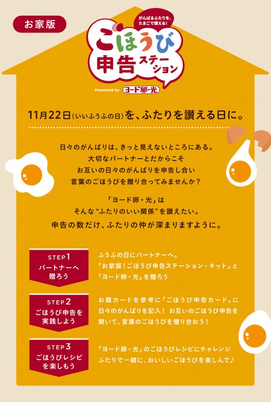 イベント会場にパートナーと来場できなかった方にも、ご自宅で"ごほうび申告"を体験いただけるよう、『お家版!ごほうび申告ステーション・キット』と『ヨード卵・光』※ を配布します。本キットは、"いい夫婦の日"をきっかけに、夫婦や恋人、家族、友人など、パートナーとのコミュニケーションを深める体験型ギフトです。「ごほうび申告カード」にお互いの想いを申告し合ったあと、同封の"ごほうびレシピ"で『ヨード卵・光』を使った料理を楽しむことで、言葉と食卓の両方に"ごほうび"を届けるひとときを提案します。
