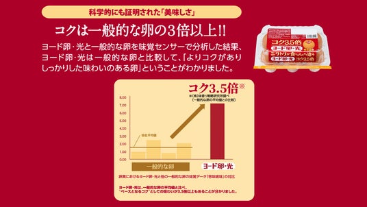 ■ヨード卵・光(よーどらん・ひかり)とは『ヨード卵・光』は1976年に誕生し2026年に発売50周年を迎える日本初(※1)のブランド卵です。ブランド卵の先駆けとして、ニワトリの食べるものからこだわり、約20年の研究を経て『ヨード卵・光』専用飼料を開発、試行錯誤を繰り返しながら誕生しました。最大の特徴はコクが3.5倍(※2)であるということ。まったりとした濃厚さと旨味を感じられます。